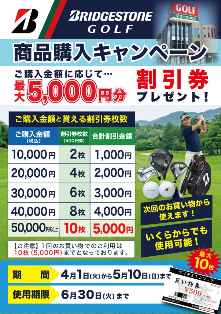 【春のお知らせ】 4/1~5/10の期間中、ブリヂストン商品をご購入いただいたお客様に、次回のお買い物から使える“最大5,000円分”の割引券をプレゼントいたします。 お買い上げ金額に応じて割引券の枚数が増える、この時期だけのちょっと嬉しいキャンペーンです。500円券なので、どんな金額のお買い物にも気軽に使っていただけます。 春の買い替えや、新しいギアのチェックにもぴったりのタイミング。 ぜひこの機会にご利用ください!(割引券の使用期限は6月末までとなっております)