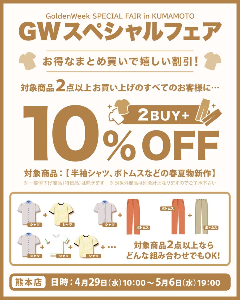 半袖シャツにボトムスなどの春夏物新作アパレル商品を2点以上お買い上げ頂いた皆様に、